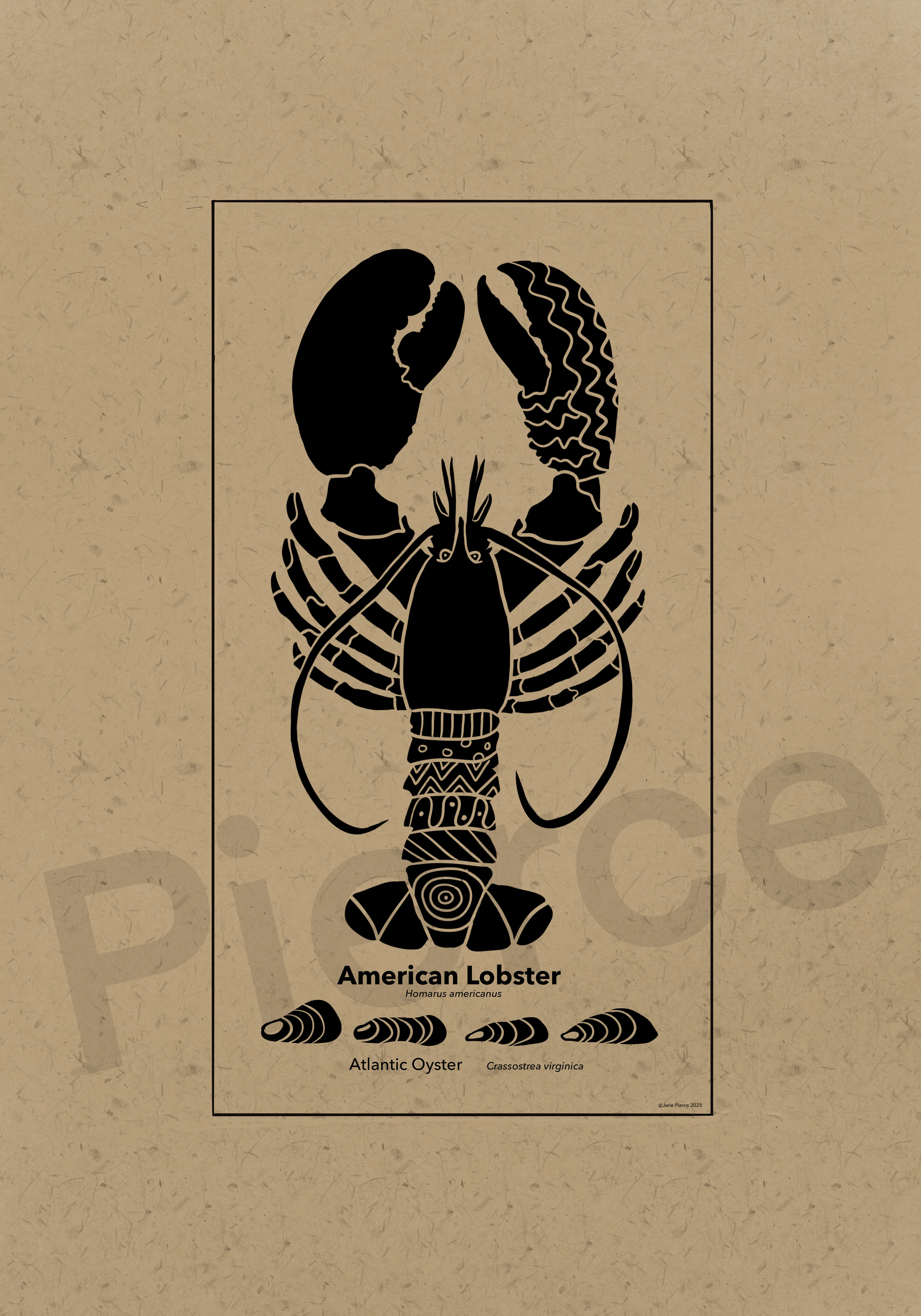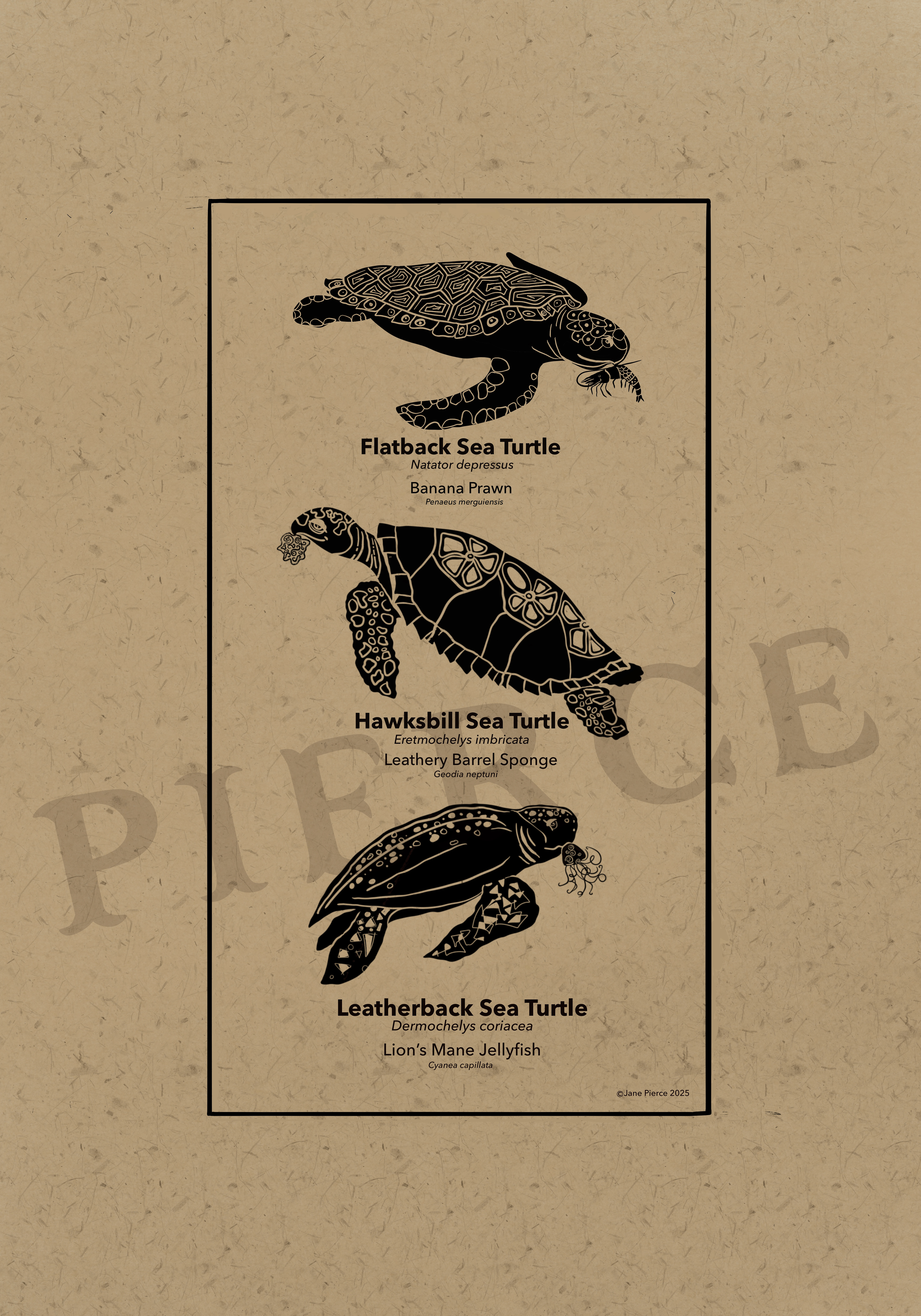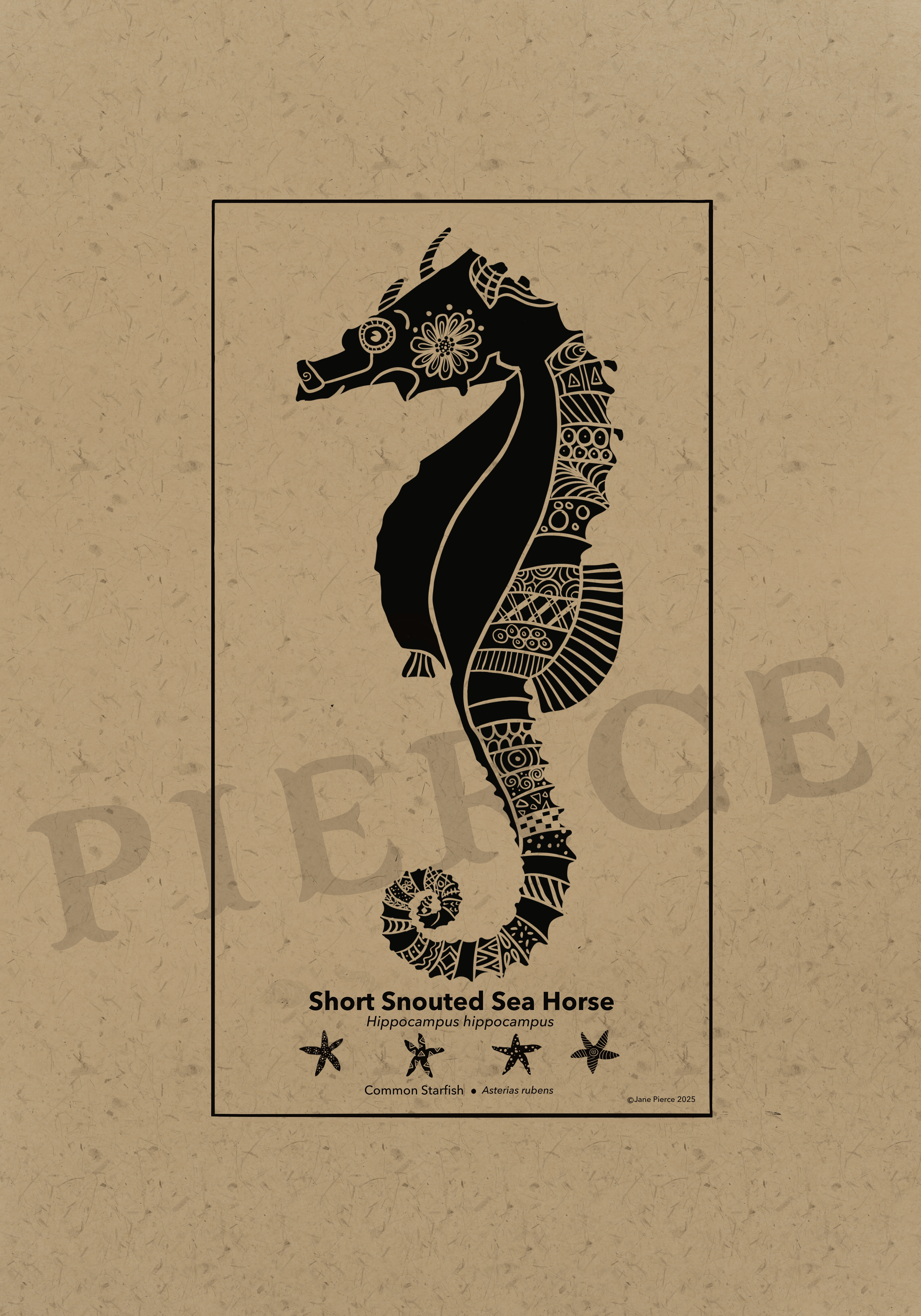 Oceanic Elegance - A Black Ink and Kraft Paper Marine Illustration Series. Dive into the depths of the ocean with "Oceanic Elegance," a captivating series of black ink and kraft paper illustrations that celebrate the intricate beauty of marine life. This collection features stunning artwork, each meticulously crafted to highlight the unique forms and textures of underwater creatures. From the delicate, flowing tendrils of the Lion's Mane Jellyfish to the robust silhouette of the American Lobster, each piece is a tribute to the diversity of the sea. The series also includes the majestic Right Whale, the resilient Hawksbill Sea Turtle, and the graceful Short Snouted Seahorse, each accompanied by smaller depictions of related marine species like scallops, oysters, and starfish. Rendered in a striking monochrome palette against a textured Kraft paper background, these whimsical marine life illustrations of a Blue Crab, Southern Stingray, Steller Sea Lion, and the Sea Lamprey sblend traditional artistry with modern design. Perfect for nature enthusiasts, costal decor marine art, or educational purposes, these Jane Pierce marine art prints invites viewers to explore the wonders of the ocean in a timeless, artistic style. Techniques: Hand-drawn digital illustration with intricate detailing and pattern work. Tool: Procreate Inspiration: The natural elegance and complexity of marine ecosystems, with a nod to vintage scientific illustrations. Usage: Suitable for prints, posters, educational materials, or digital art.