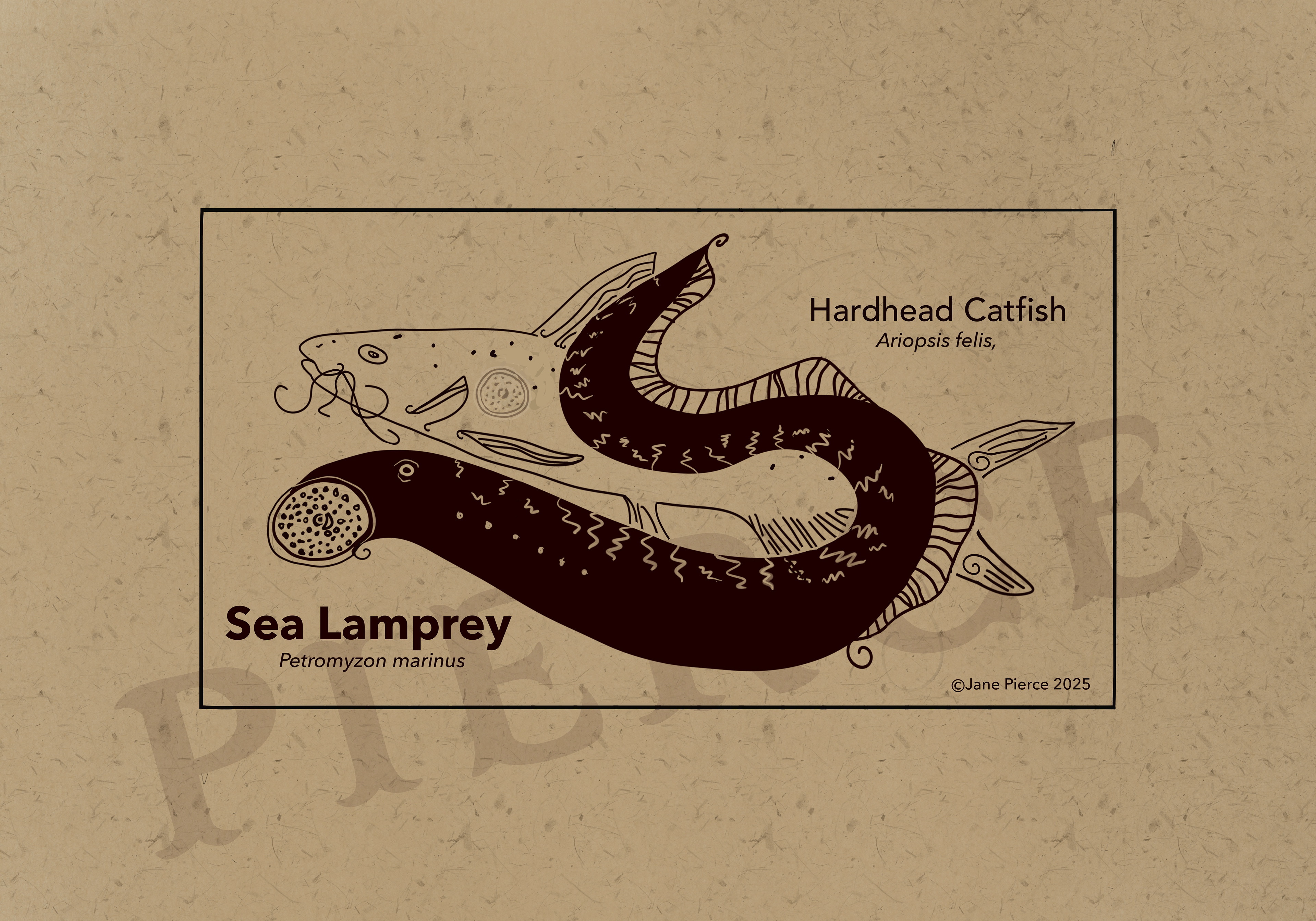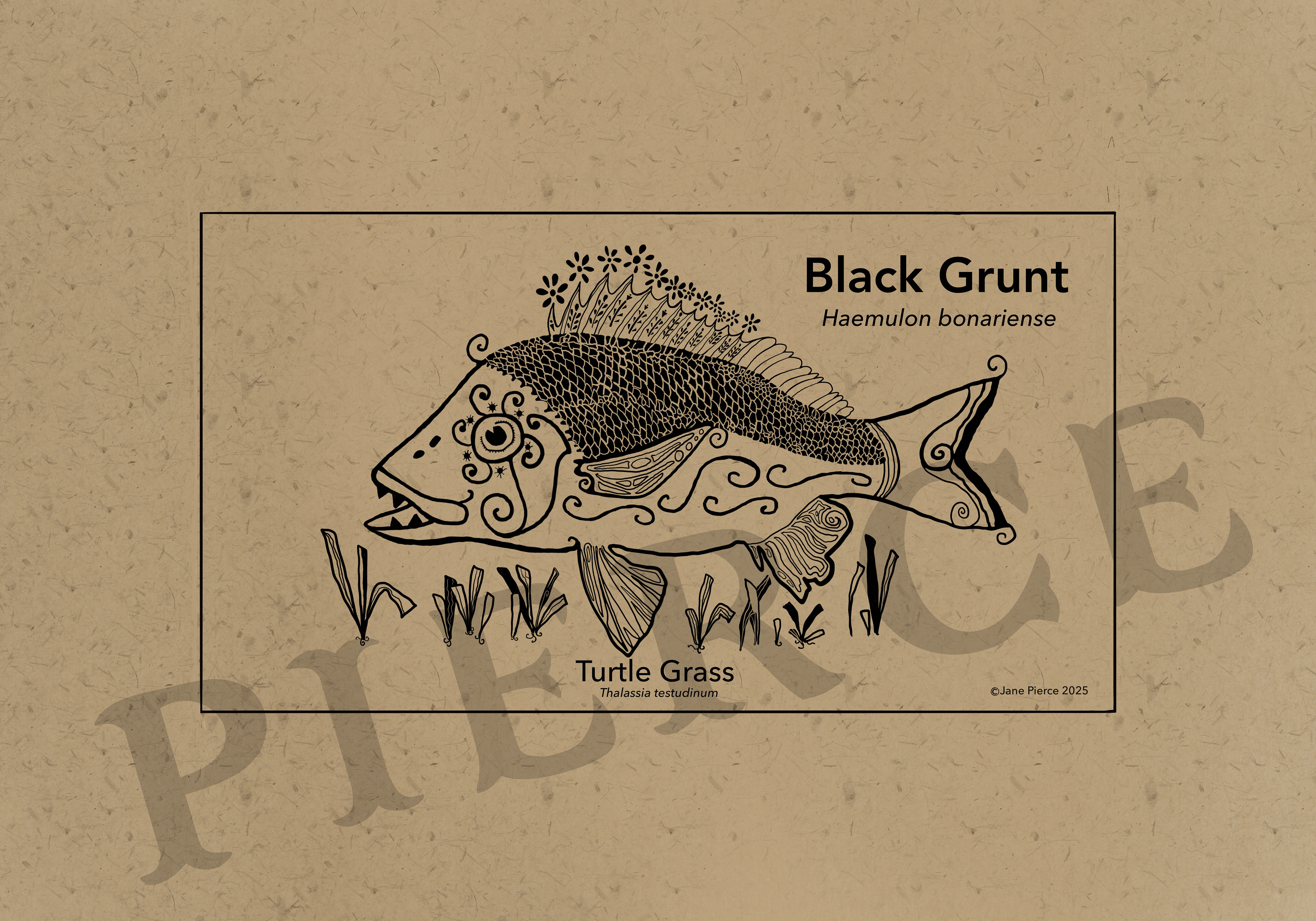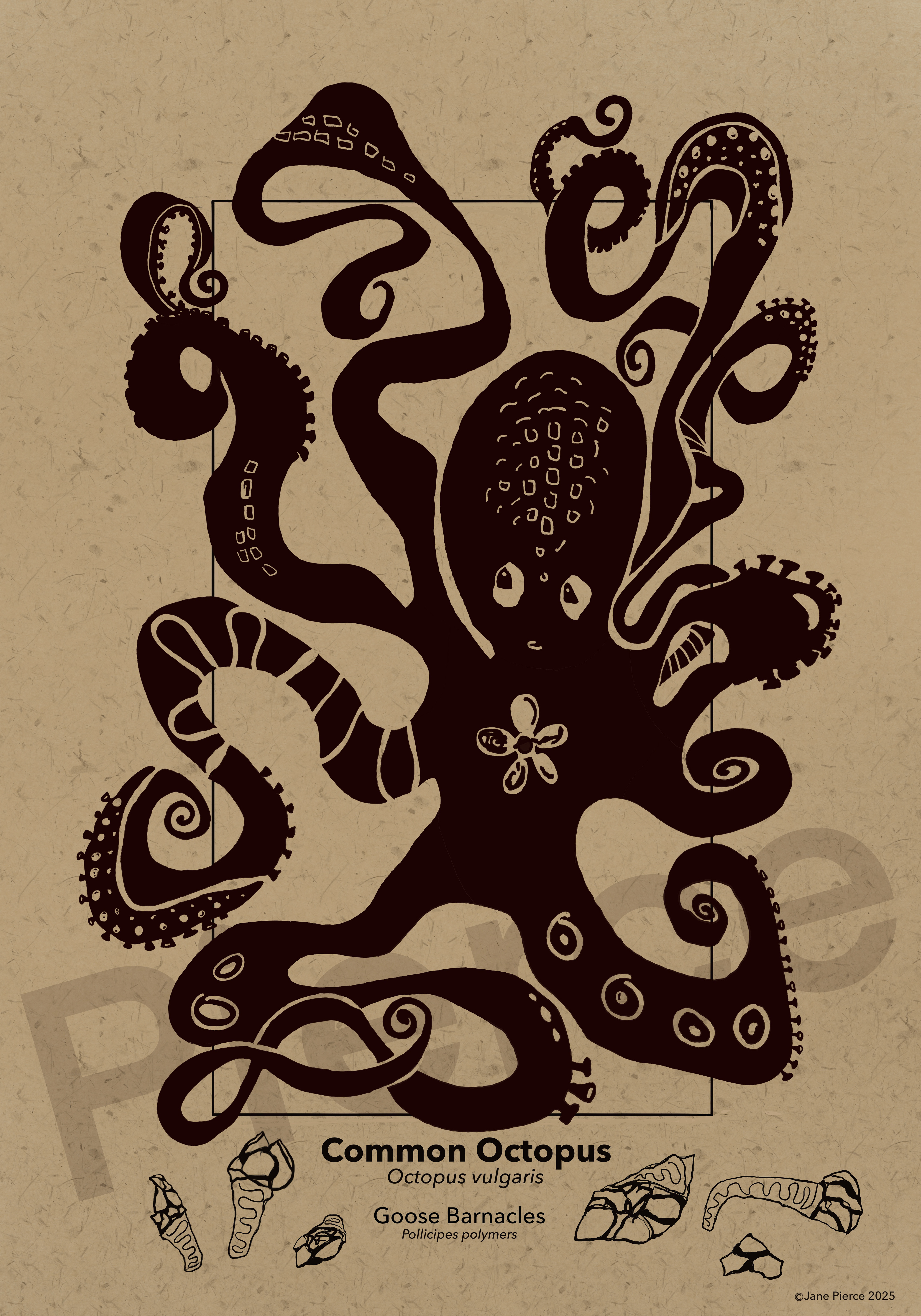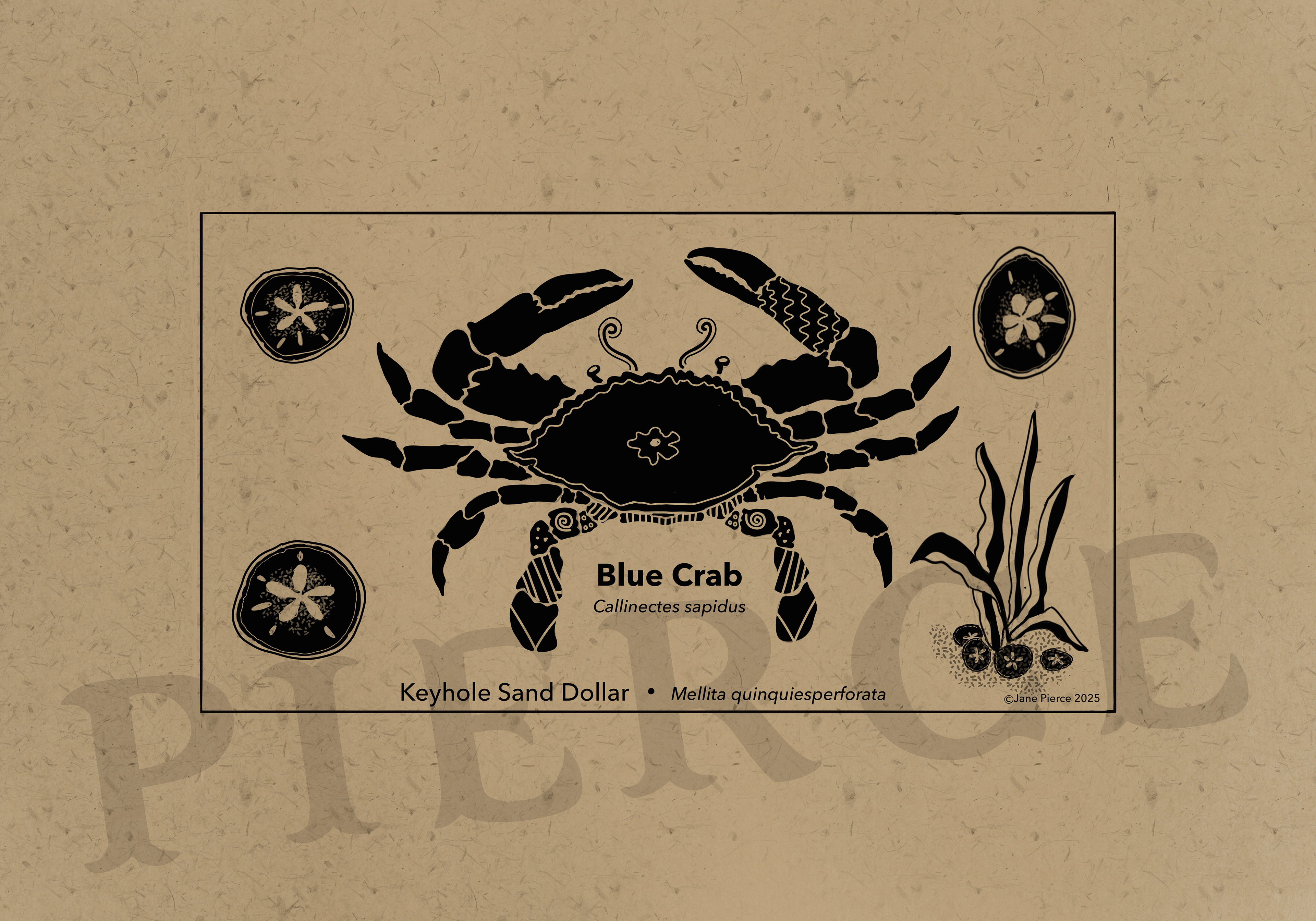 Oceanic Elegance - A Black Ink and Kraft Paper Marine Illustration Series. Dive into the depths of the ocean with "Oceanic Elegance," a captivating series of black ink and kraft paper illustrations that celebrate the intricate beauty of marine life. This collection features stunning artwork, each meticulously crafted to highlight the unique forms and textures of underwater creatures. From the delicate, flowing tendrils of the Lion's Mane Jellyfish to the robust silhouette of the American Lobster, each piece is a tribute to the diversity of the sea. The series also includes the majestic Right Whale, the resilient Hawksbill Sea Turtle, and the graceful Short Snouted Seahorse, each accompanied by smaller depictions of related marine species like scallops, oysters, and starfish. Rendered in a striking monochrome palette against a textured Kraft paper background, these whimsical marine life illustrations of a Blue Crab, Southern Stingray, Steller Sea Lion, and the Sea Lamprey sblend traditional artistry with modern design. Perfect for nature enthusiasts, costal decor marine art, or educational purposes, these Jane Pierce marine art prints invites viewers to explore the wonders of the ocean in a timeless, artistic style. Techniques: Hand-drawn digital illustration with intricate detailing and pattern work. Tool: Procreate Inspiration: The natural elegance and complexity of marine ecosystems, with a nod to vintage scientific illustrations. Usage: Suitable for prints, posters, educational materials, or digital art.